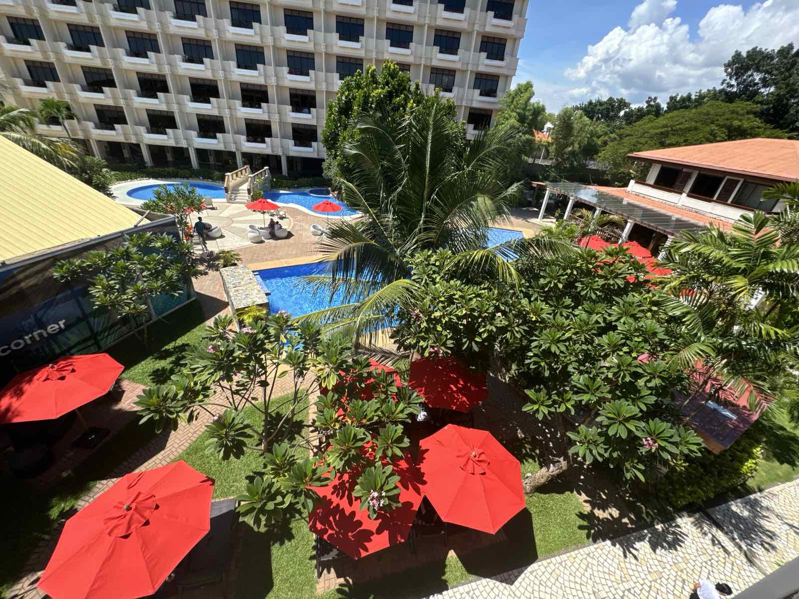 ヤシの木が揺れる美しい庭園と、白砂のプライベートビーチ、深さが様々な2種類のプールと所々にたつ真っ赤なパラソルがより南国感を醸し出し、すべてが一体となったコンパクトさが魅力のリゾートホテルです。