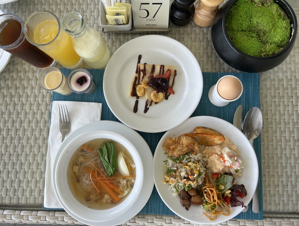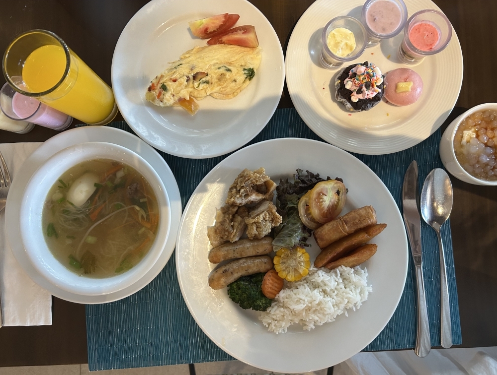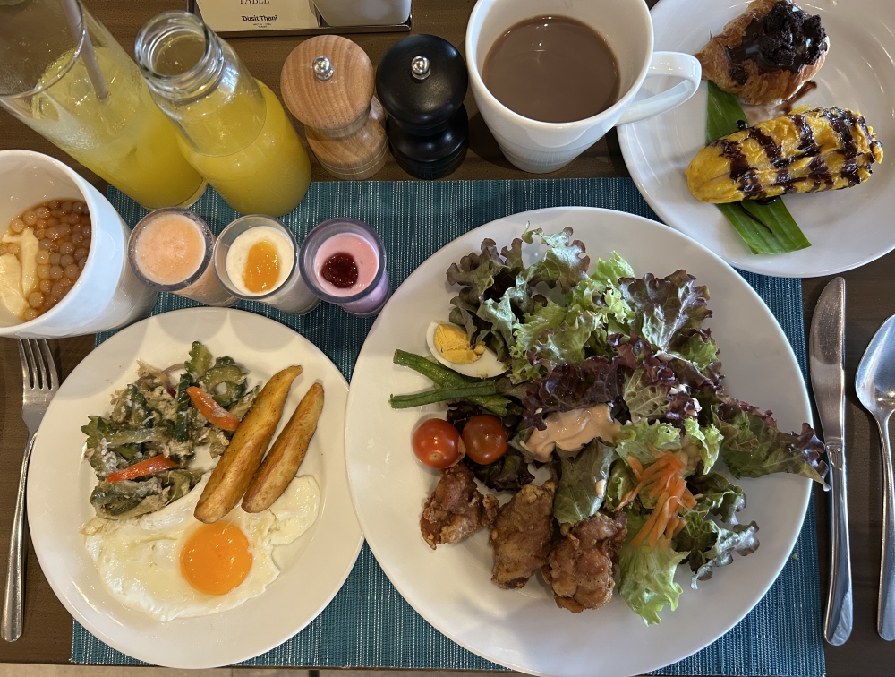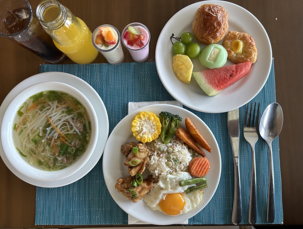 朝食はビュッフェ形式でたくさん種類がありました。レストランはビーチ沿いにあり、テラス席で絶景を眺めながらの朝ご飯は最高でした。